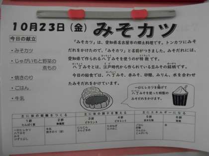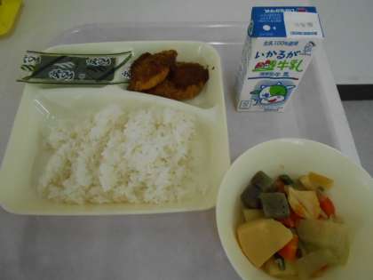 本日の献立は、ごはん、焼きのり、みそカツ、ジャガイモと野菜の煮物、牛乳です。本日の献立の「みそカツ」は、愛知県でつくられる八丁味噌を使った愛知県名古屋市の郷土料理です。