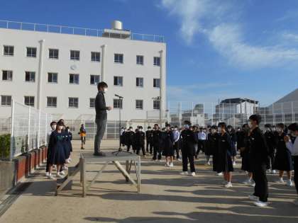 本日、全校集会を上グラウンドで行いました。生活指導部の山下先生から、生活指導だよりに掲載しているアンケート結果を振り返ってみて、生徒の皆さんに日頃から心掛けてほしいこととして、「自発的な活動(自ら進んで積極的に取り組む姿)」と「傾聴することの意味を考えること(他人の話を聞いて自分のものとしていくための判断する力)」についてのお話がありました。