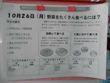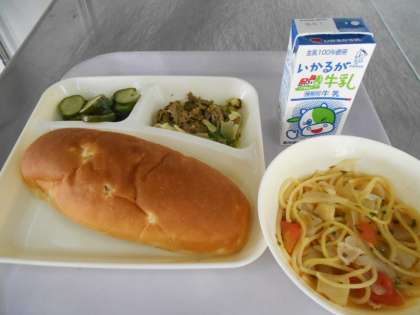 本日の献立は、おさつパン、牛肉のカレー風味焼き、ホタテ貝とトマトのスープスパゲッティ、きゅうりのサラダ、牛乳です。本日の献立は、洋食メニューです。