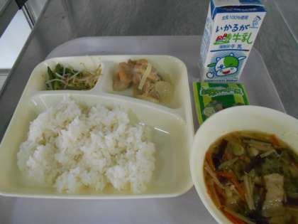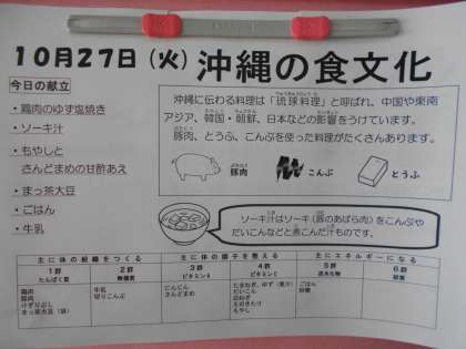 本日の献立は、ごはん、鶏肉のゆず塩焼き、もやしとさんど豆の甘酢あえ、ソーキ汁、牛乳です。本日の献立「ソーキ汁」は、沖縄に伝わる琉球料理の一つで、豚のあばら肉(ソーキ)を昆布や大根などで煮込んでつくられます。