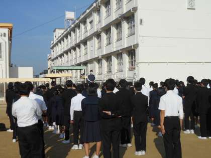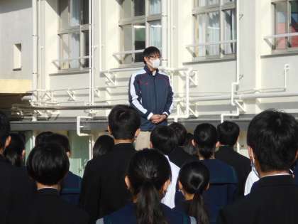 2年生の学年集会を下グラウンドで行いました。落合先生から、今週末の文化祭に向けて、学年として取り組んで頑張ってきたことについてのお話がありました。