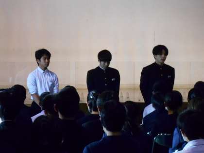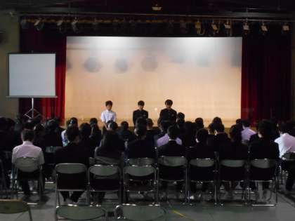 3年生の学年集会を講堂で行いました。明日の文化祭に向けて、各パートの代表者から「これまでの頑張りを明日の舞台発表で精一杯に出しきろう」という呼びかけがありました。
