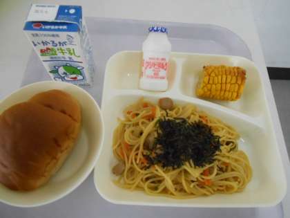 本日の献立は、黒糖パン(1/2)、ウインナーときのこのしょうゆ風味スパゲティ、焼きトウモロコシ、発酵乳、牛乳です。本日の献立の「ウインナーときのこのしょうゆ風味スパゲティ」で使われているキノコは、しいたけとしめじで、給食では他に、エノキタケ、マイタケ、エリンギ、マッシュルーなどが使われます。