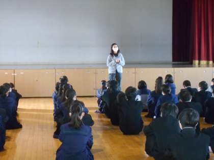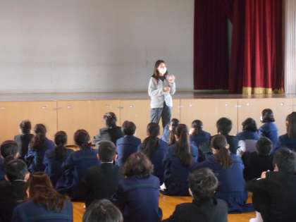 1年生の学年集会を講堂で行いました。麻生先生から、飾ることなく自分らしく、そして、プラス思考で物事を考えて、学校生活を有意義に過ごしてほしいというお話がありました。