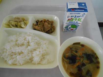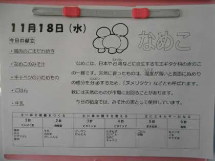 本日の献立は、ごはん、鶏肉のごまだれ焼き、キャベツの炒め物、なめこのみそ汁、牛乳です。本日の献立「なめこのみそ汁」に使われている「なめこ」は、モエギタケ科のキノコの仲間で、「ヌメリタケ」などとも呼ばれることがあります。本日のみそ汁の具材として使われています。