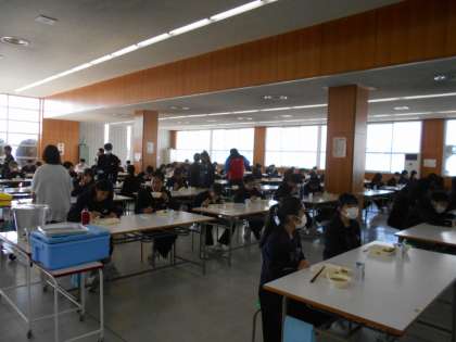 (写真は、昼食ホールでの1年生の昼食の様子です。)