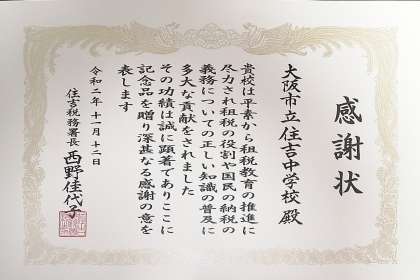 住吉税務署から署長さんが来校されて、住吉中学校のこれまでの税の作文の取り組みや租税教室の積極的な開催に対する感謝状が手渡されました。