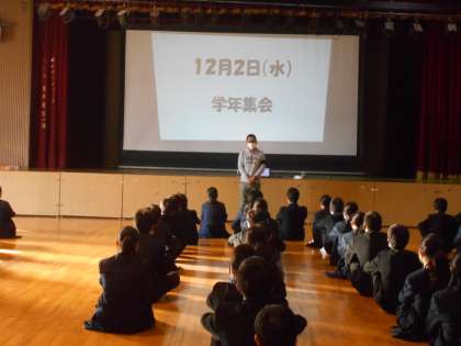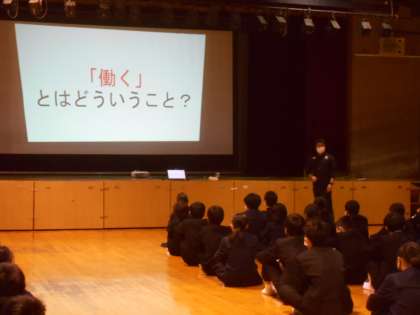 2年生の学年集会を講堂で行いました。吉江先生から、「職業」について、また、「働くことの意味」についてのお話がありました。