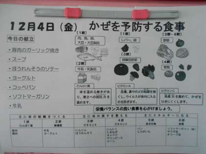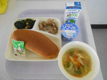 本日の献立は、コッペパン、ソフトマーガリン、豚肉のガーリック焼き、ほうれん草のソテー、スープ、ヨーグルト、牛乳です。日ごとに寒さが増していますが、栄養バランスの良い食事をこころがけることで、風邪の予防となります。