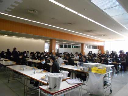 (写真は、昼食ホールでの2年生の昼食準備の様子です。)