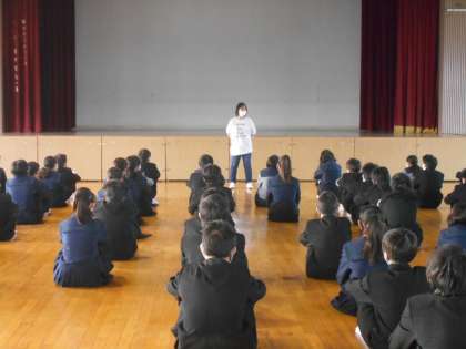 1年生の学年集会を講堂で行いました。中島先生から、小学校の頃から比べると格段に成長した喜びと、これからの更なる頑張りについてのお話がありました。そして、自分を好きになること、自分を認めること、また、耐え抜くことや我慢することの大切さについてもお話がありました。