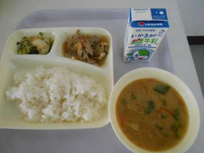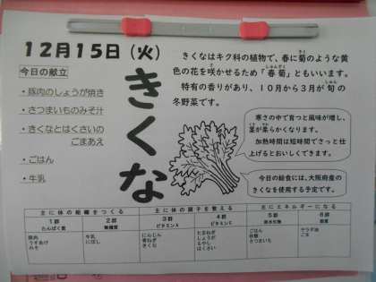 本日の献立は、ごはん、豚肉の生姜焼き、菊菜と白菜のごま和え、サツマイモのみそ汁、牛乳です。本日の献立「菊菜と白菜のごま和え」で使われた「菊菜」は、キク科の植物で、春に菊のような黄色の花を咲かせるので「春菊」とも呼ばれています。