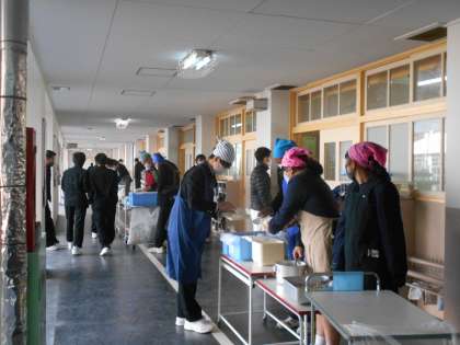 (写真は、3年生廊下での3年生の昼食準備の様子です。)