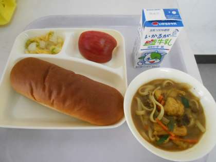 本日の献立は、黒糖パン、カレーうどん、白菜のおひたし、りんご、牛乳です。本日の献立で登場した「カレーうどん」で使われている「うどん」は、奈良時代に伝わったお菓子「こんとん」が始まりだそうです。「こんとん」は小麦粉の皮にあんを包んでつくった団子のようなもので、温かい汁に入れて食べるようになってから「温頓(おんとん)」と呼ばれ、「温飩(おんとん)」が「饂飩(うんとん)」となって、室町時代には「うどん」と呼ばれるようになったようです。