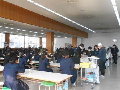 (写真は、昼食ホールでの1年生の給食準備の様子です。)