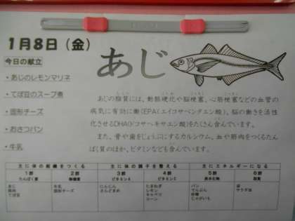 本日の献立は、おさつパン、固形チーズ、アジのレモンマリネ、てぼ豆のスープ煮、牛乳です。本日の献立「アジのレモンマリネ」のアジは、骨や歯を丈夫にするカルシウムや、血や筋肉をつくるタンパク質、ビタミンなどが豊富に含まれた食材です。