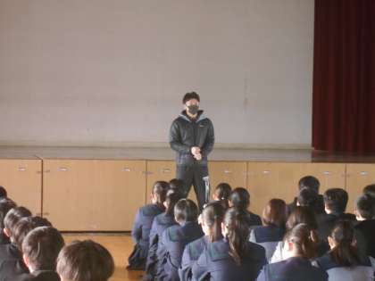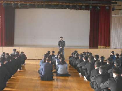 3年生の学年集会を講堂で行いました。上床先生から、「周りにいる多くの人たちの支えがあって、君たち一人ひとりの今がある。」というお話がありました。