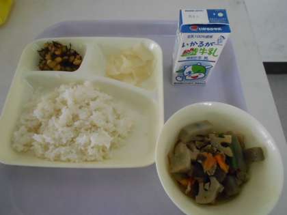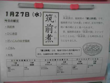 本日の献立は、ごはん、筑前煮、ひじき豆、大根のゆず風味、牛乳です。本日の献立「筑前煮」は、福岡県の郷土料理で、正月や祭り、お祝い事のときなどによく食べられるそうです。