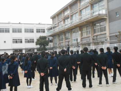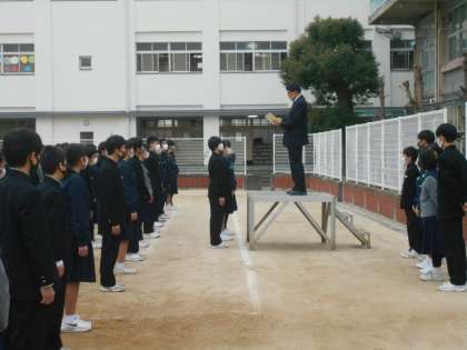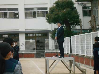 本日の全校集会で、大阪市中学校文化連盟主催によるソロコンテストで、吹奏楽部の部員が入賞しましたので、表彰を行いました。2月に入り、明日2月2日は節分、明後日の2月3日は立冬となります。まだまだ寒さが和らぐ気配はありませんが、新型コロナウイルス感染症拡大防止のための対策を行いながら、学校では「学びの継続」を進め、全ての子どもたちの健やかな成長を願い、限られた時間を有効に使って、しっかりと教育活動を進めて参ります。ご家庭でも、引き続き、子どもたちの健康管理をよろしくお願いいたします。