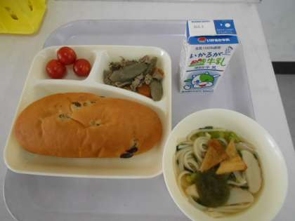 本日の献立は、レーズンパン、なにわうどん、豚肉とごぼうの煮物、プチトマト、牛乳です。本日の献立「なにわうどん」は、大阪市の学校給食ではきつねうどんをイメージしながら、三角に切って甘辛く煮た薄上げと、かまぼこ、青ネギに加えてとろろこんぶをのせて、「なにわうどん」と名付けています。