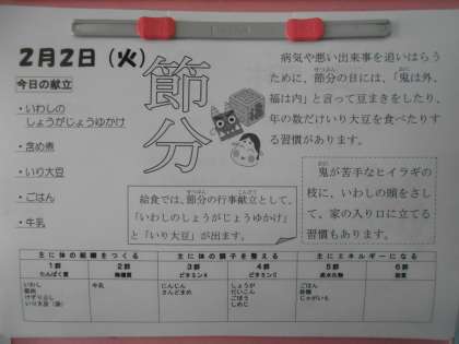 本日の献立は、ごはん、イワシの生姜醤油かけ、ふくめ煮、いり大豆、牛乳です。本日の献立「イワシの生姜醤油かけ」と「いり大豆」は、節分の日の行事献立です。節分の日には、病気や悪い出来事を追い払うために、豆まきをしたり、年の数だけいり大豆を食べたりする習慣があります。