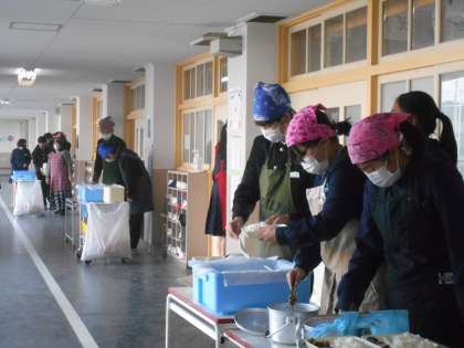 (写真は、3年生廊下での3年生の給食準備の様子です。)