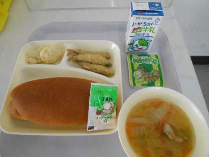 本日の献立は、コッペパン、ソフトマーガリン、ワカサギのフライ、カリフラワーのサラダ、白菜のスープ、抹茶大豆、牛乳です。本日の献立「ワカサギのフライ」で使われている「ワカサギ」は、シシャモと同じくキュウリウオ科の魚で、あっさりとしている白身の魚で、骨がやわらかいため、フライにすると丸ごと食べることができ、カルシウムの補給となる食材です。