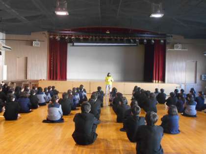 1年生の学年集会を講堂で行いました。東野先生から、「行事を楽しむ」ことと、そのためには「ルールを守ることが大切である」ことについてのお話がありました。