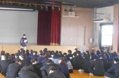 5限に講堂で、進路指導主事の落合先生から、3年生に「明日の私立高校入試に向けて」の注意するべきことについてお話がありました。また、学年主任の安田先生からも入試当日の気構えについてのお話がありました。日頃の持てる力を十分発揮して、それぞれの進路獲得に向けて頑張ってくれることを願っています。