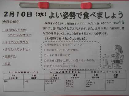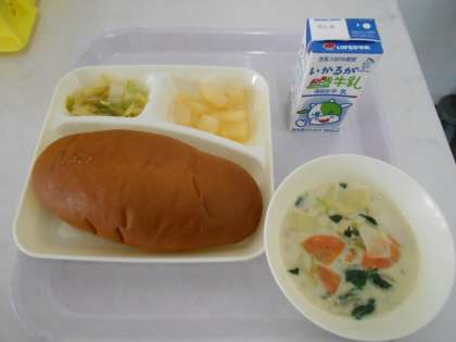 本日の献立は、黒糖パン、ほうれん草のクリームシチュー、キャベツのサラダ、洋ナシ、牛乳です。本日の献立は、野菜たっぷりの健康的な洋食メニューです。