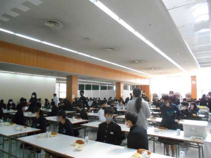 (写真は、昼食ホールでの2年生の給食準備の様子です。)