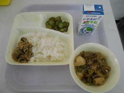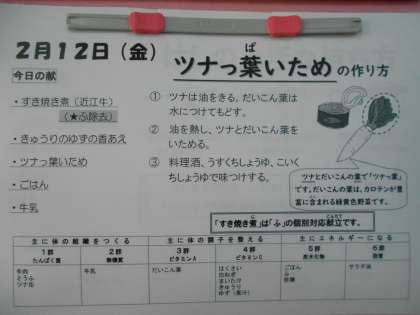 本日の献立は、ごはん、近江牛のすき焼き煮、キュウリのゆずの香和え、ツナっ葉いため、牛乳です。本日の献立「ツナっ葉いため」は、ツナと大根の葉を炒めて、醤油や料理酒などで味を調えてつくられています。大根の葉は、カロテンが豊富に含まれた緑黄色野菜です。