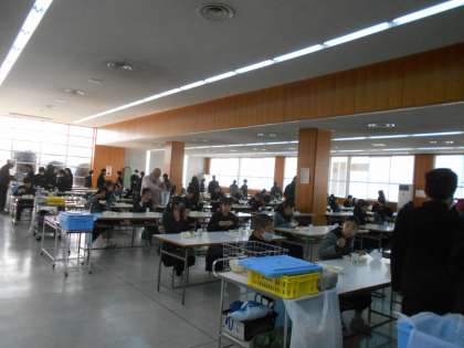 (写真は、昼食ホールでの1年生の給食準備の様子です。)