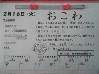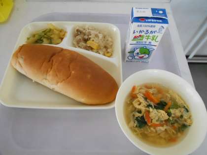 本日の献立は、おさつパン、中華おこわ、キャベツとピーマンの炒めもの、卵スープ、牛乳です。本日の献立「中華おこわ」は、もち米を蒸したご飯に、焼き豚、栗、しいたけが入っています。