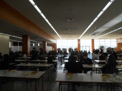 (写真は、昼食ホールでの2年生の給食準備の様子です。)