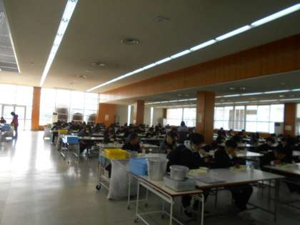 (写真は、昼食ホールでの1年生の給食の様子です。)