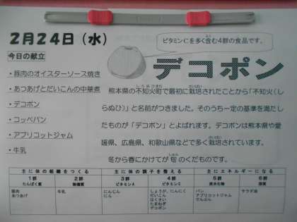 本日の献立は、コッペパン、アプリコットジャム、豚肉のオイスター焼き、厚揚げと大根の中華煮、デコポン、牛乳です。本日の献立に登場した「デコポン」は、熊本県不知火町で栽培され始めた「不知火(しらぬい)」という品所の中で、一定の基準を満たしたものが「デコポン」と呼ばれています。ビタミンCが豊富に含まれ、冬から春にかけてが旬となる果物です。