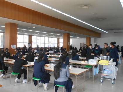 (写真は、昼食ホールでの1年生の給食準備の様子です。)
