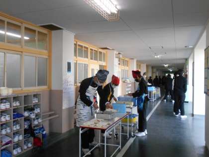 (写真は、3年生廊下での3年生の給食準備の様子です。)