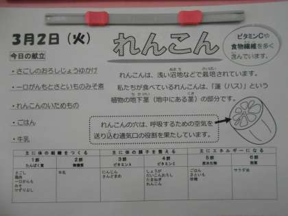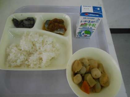 本日の献立は、ごはん、さごしのおろし醤油かけ、一口がんもと里芋のみそ煮、レンコンの炒めもの、牛乳です。本日の献立「レンコンの炒めもの」で使われている「レンコン」は、浅い沼地で栽培される野菜で、ビタミンCや食物繊維をたくさん含んでいます。