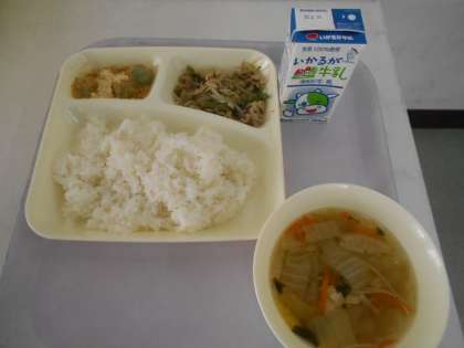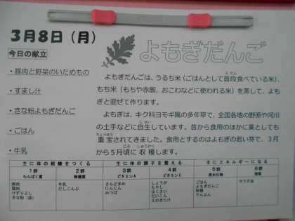 本日の献立は、ごはん、豚肉と野菜の炒めもの、すまし汁、きな粉よもぎ団子、牛乳です。本日の献立「よもぎ団子」は、うるち米ともち米を蒸したうえで、よもぎを混ぜてつくられます。