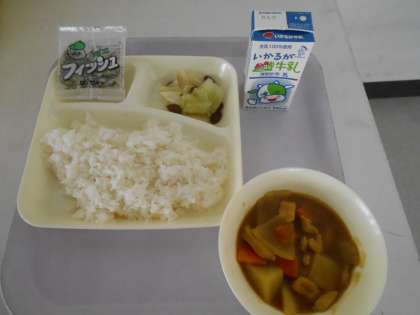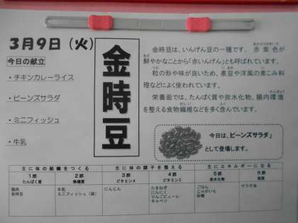 本日の献立は、チキンカレーライス、ビーンズサラダ、ミニフィッシュ、牛乳です。本日の献立「ビーンズサラダ」には、いんげん豆の一種である金時豆が使われています。金時豆には、たんぱく質や炭水化物、食物繊維がたくさん含まれています。