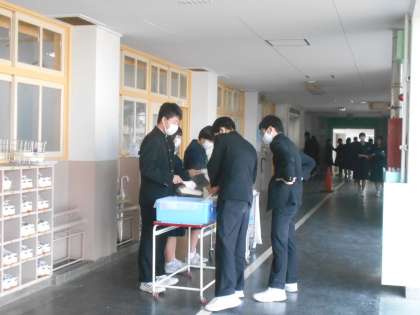 (写真は、3年生廊下での3年生の給食準備の様子です。)