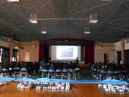 2年生の学年集会を講堂で行いました。吉江先生から、合唱曲「旅立ちの日に」の紹介と併せて、渡り鳥であるガンの習性から「シナジー(みんなでつくりあげる力)を創り出す」ことについてのお話がありました。