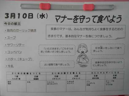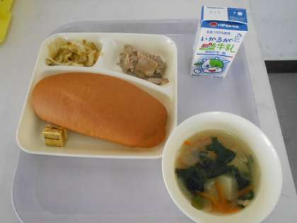 本日の献立は、コッペパン、バター、豚肉のガーリック焼き、サワーソテー、スープ、牛乳です。本日の献立は洋食メニューです。
