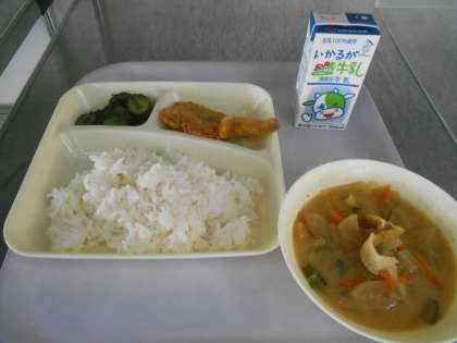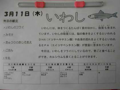 本日の献立は、ごはん、イワシのフライ、キュウリの赤じそ和え、みそ汁、牛乳です。本日の献立「イワシのフライ」に使われている「イワシ」は、たんぱく質の他に脂質も含まれた食材です。