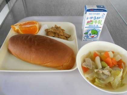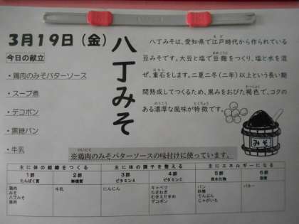 本日の献立は、黒糖パン、鶏肉のみそバターソース、スープ煮、デコポン、牛乳です。本日の献立「鶏肉のみそバターソース」で使われている「八丁味噌」は、愛知県で江戸時代からつくられている豆味噌で、二年以上の長期間にわたって熟成され、コクのある濃厚な風味が特徴となっています。