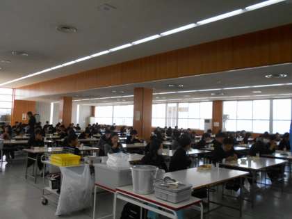 (写真は、昼食ホールでの1年生の給食の様子です。)