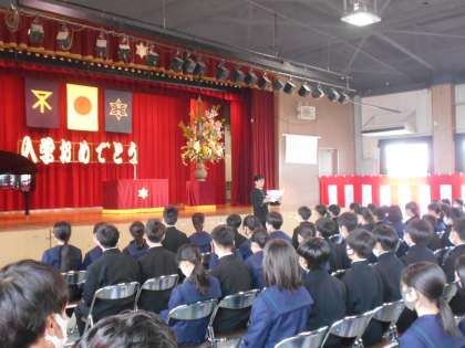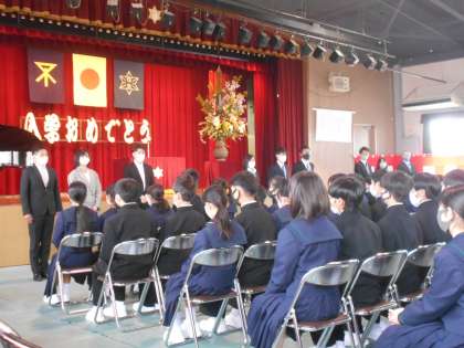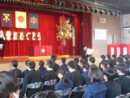 新入生107名を迎えての入学式は、式辞、祝辞の後、在校生代表からの言葉、そして、新入生代表の言葉と続き、学年所属の先生方が紹介されました。