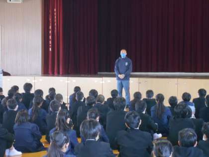 講堂で、2年生の学年集会を行いました。学年所属の先生方から、自己紹介と2年生としてのこれからの1年間の過ごし方についてのお話がありました。